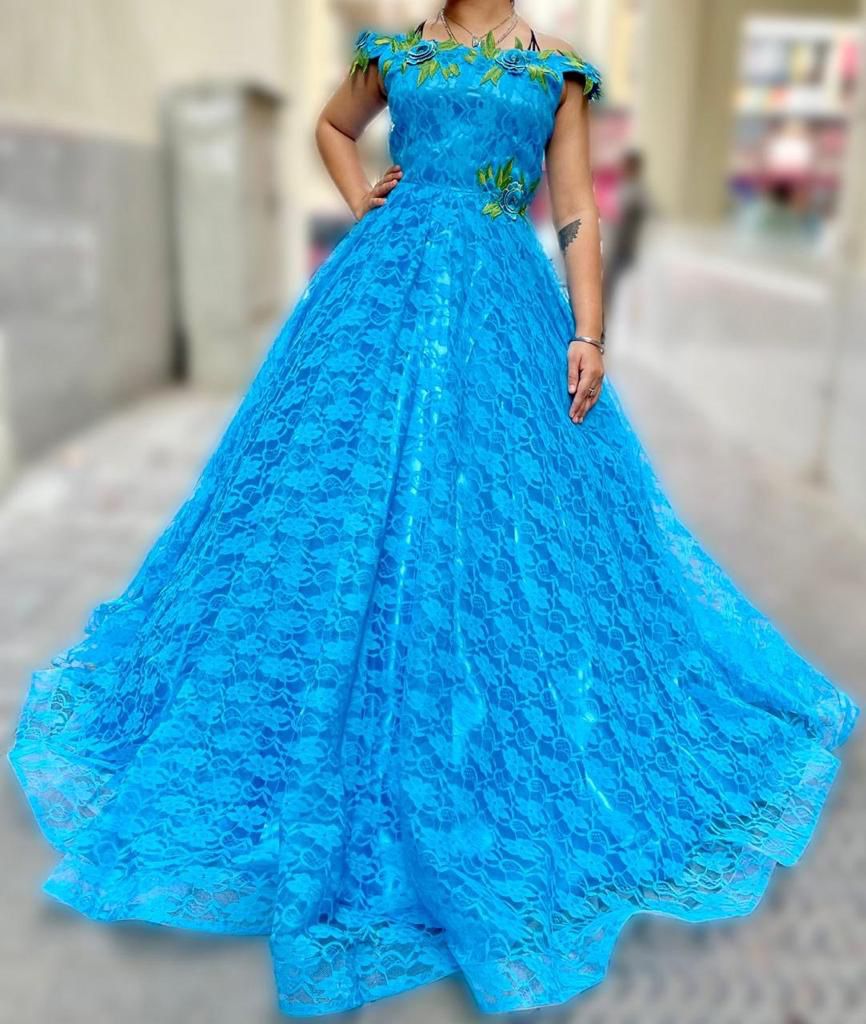 Step into a world of elegance with our Azure Elegance Lace Gown. This stunning floor-length gown features a captivating bright blue lace fabric that exudes sophistication and charm. The off-the-shoulder design is adorned with delicate floral embellishments around the neckline and waist, adding a touch of romantic flair. The voluminous skirt flares out dramatically, creating a graceful and regal silhouette. Perfect for formal events or special occasions, this gown will make you feel like royalty. Embrace timeless beauty and turn heads with this exquisite piece.