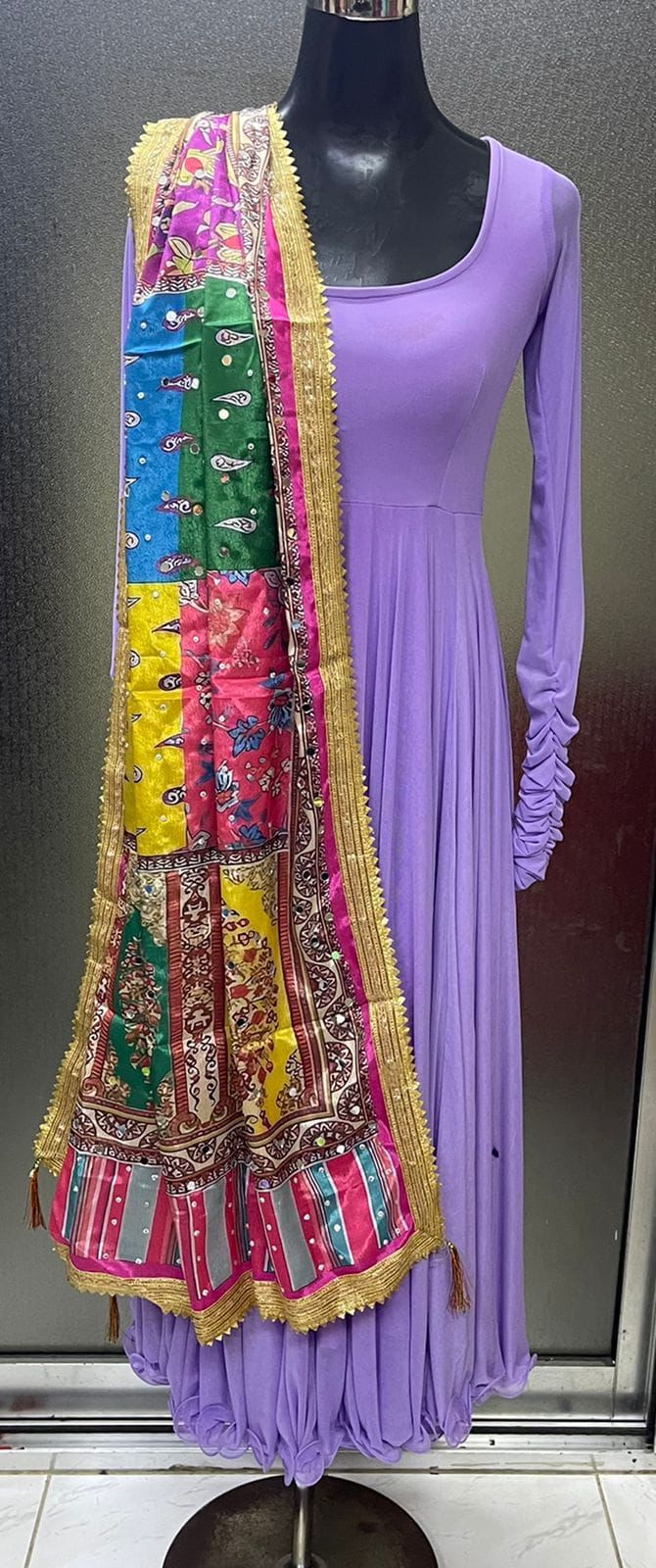 This stunning lilac Anarkali suit features a flowing silhouette and long sleeves with ruffled cuffs. It comes with a vibrant patchwork dupatta adorned with colorful embroidery and gold accents.