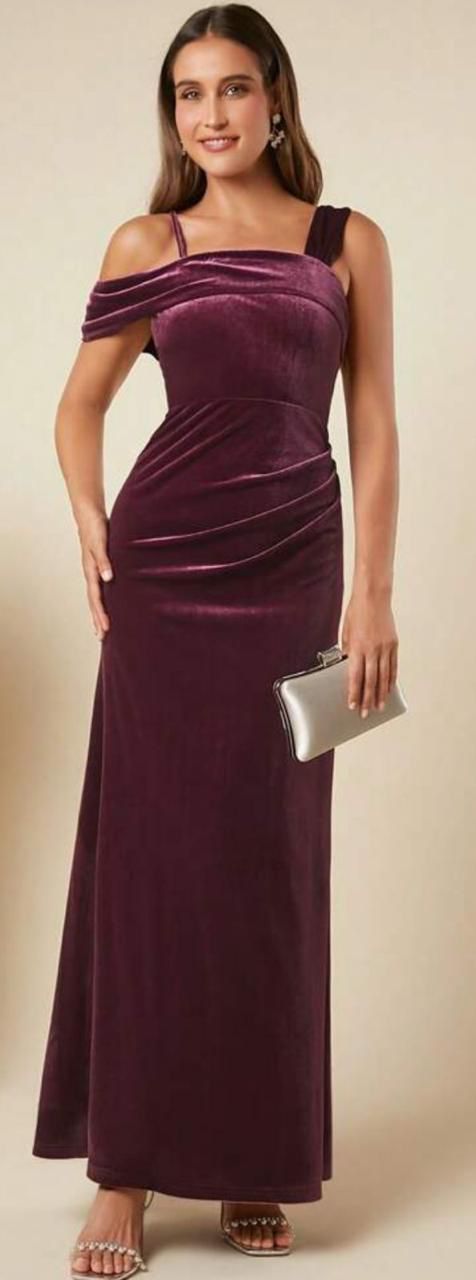 Elevate your evening wear with our Burgundy Velvet Elegance Gown. This stunning off-the-shoulder gown is crafted from luxurious velvet, offering a rich and smooth texture that exudes sophistication. The deep burgundy hue adds a touch of timeless elegance, while the draped detail across the chest and single strap design provide a modern twist. Perfect for formal events or special occasions, this gown is paired with a silver clutch bag and strappy high-heeled sandals adorned with delicate embellishments, completing the look with refined grace.