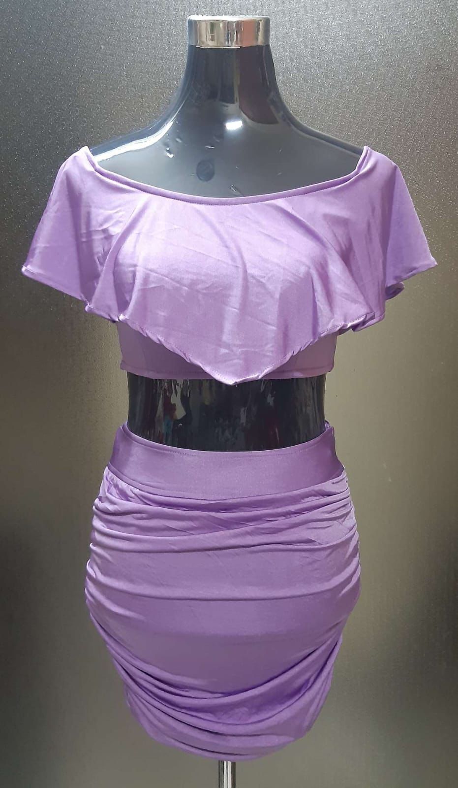 Turn heads with our Amethyst Allure Two-Piece Set. This elegant outfit features an off-the-shoulder crop top with a chic ruffled design and a matching high-waisted ruched skirt. The rich purple hue adds a touch of sophistication, while the ruched texture creates a flattering silhouette. Perfect for a night out or a special occasion, this set combines modern style with timeless elegance. Make a statement and exude confidence in this stunning ensemble.