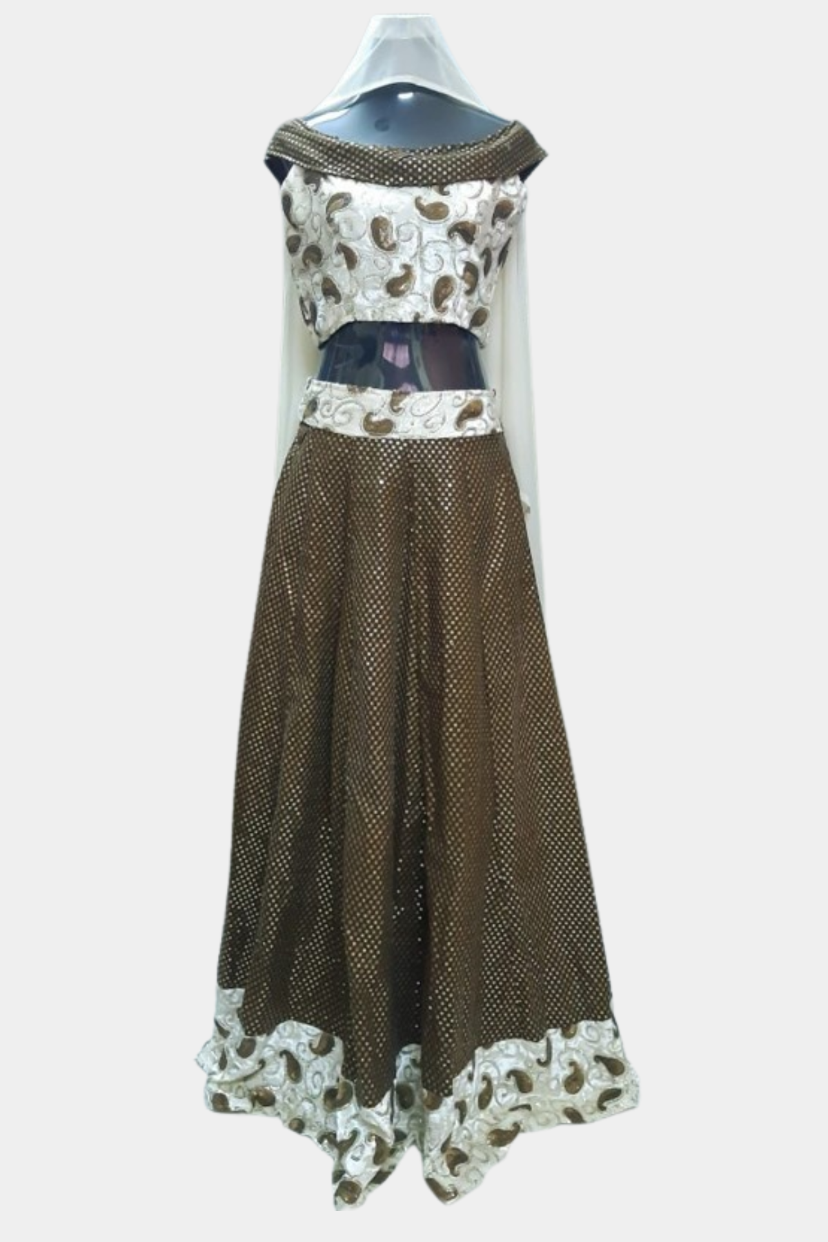 Embrace the beauty of nature with the Earthy Elegance Lehenga Choli. The rich brown hue is complemented by intricate paisley patterns and golden accents, creating a look that is both elegant and sophisticated. The off-shoulder choli and flowing skirt add a touch of drama, making it perfect for any special occasion.