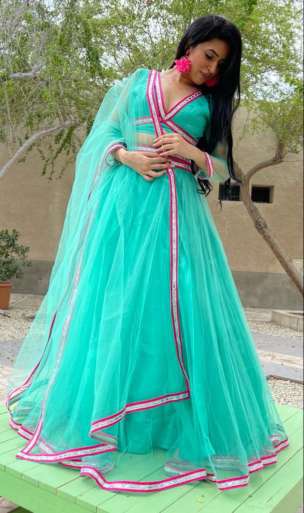This enchanting choli set features a vibrant green choli adorned with delicate embroidery. The matching duppatta with a soft pink border adds a touch of contrast and elegance. Perfect for festive occasions and weddings.
