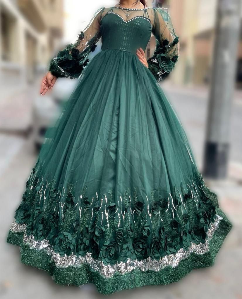Step into a world of elegance with our Emerald Enchantment Gown. This stunning dark green gown features a fitted bodice adorned with intricate beadwork and a sweetheart neckline. The sheer sleeves are embellished with delicate floral appliqués and beads, adding a touch of sophistication. The voluminous skirt is adorned with floral appliqués and silver accents near the hemline, creating a luxurious and detailed appearance. Perfect for formal occasions, this gown combines classic beauty with modern elegance, ensuring you make a lasting impression.