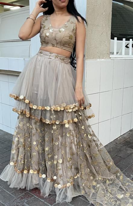 Experience timeless elegance with this exquisite lehenga. The elegant gold choli features intricate embroidery, while the detailed skirt with delicate ruffles adds a touch of romantic charm. This is a perfect choice for a special occasion.