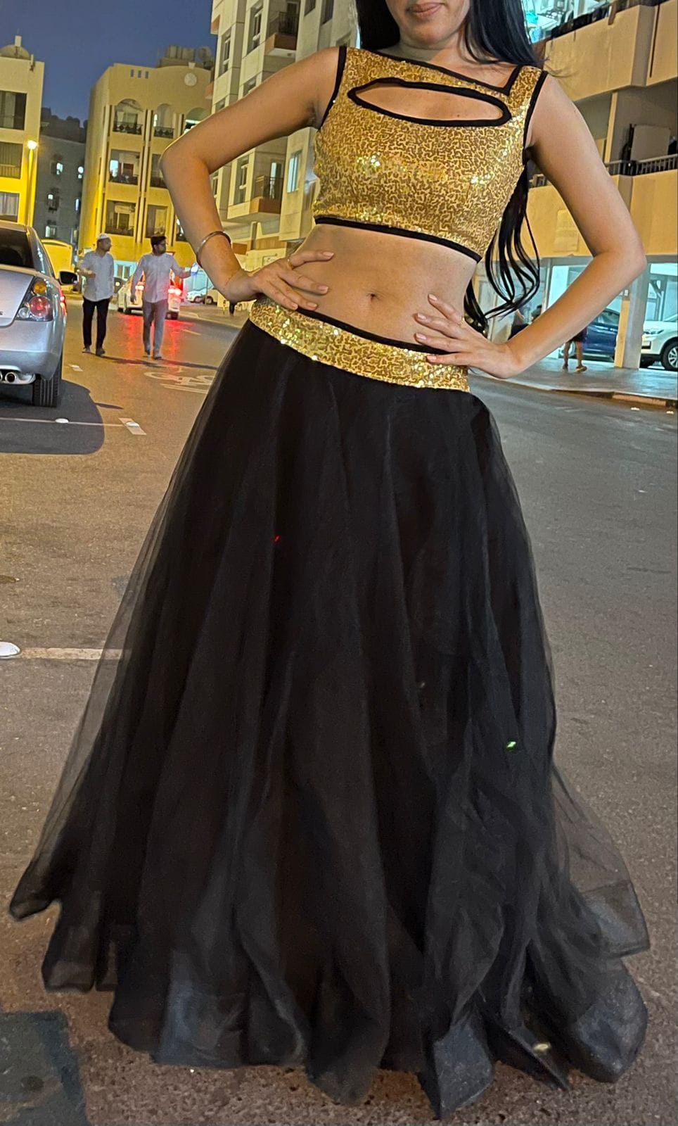 This enchanting lehenga features a flowing black net skirt that drapes elegantly. The shimmering gold sequin top adds a touch of dazzling glamour, making it perfect for a night of celebration.
