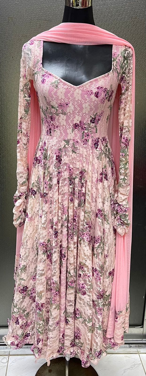 This romantic Anarkali suit is a vision in soft pink. The delicate lace fabric features a beautiful floral print, creating a look that is both elegant and ethereal. The matching dupatta completes the ensemble, making it perfect for special occasions.
