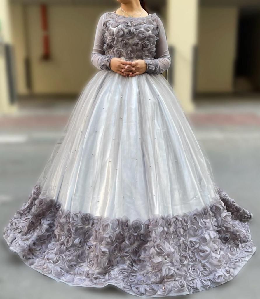 Embrace elegance with our White Floral Fantasy Gown. This stunning gown features a sheer overlay adorned with intricate floral designs made of fabric roses. The top part of the gown, including the sheer sleeves, is embellished with these delicate fabric roses, adding a touch of romance. The voluminous skirt, complete with a dense arrangement of floral designs at the hem, creates a majestic ball gown silhouette. Perfect for weddings, galas, or any special occasion, this gown combines timeless beauty with modern sophistication, ensuring you make a memorable entrance.