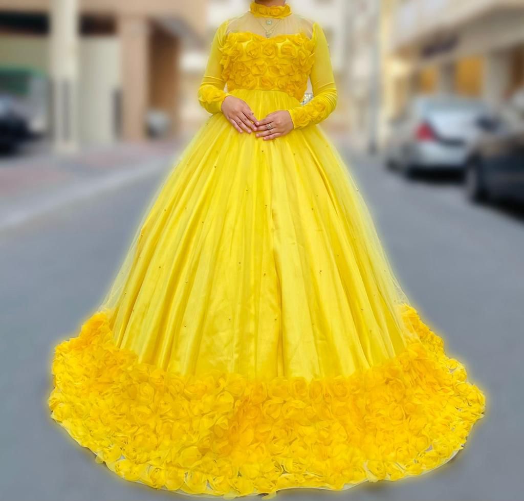 Embrace elegance and charm with our Yellow Blossom Dream Gown. This stunning floor-length gown features a bright yellow hue that radiates joy and sophistication. The fitted bodice is adorned with delicate fabric flowers, adding a romantic touch to the ensemble. The voluminous skirt flows gracefully, with a border of fabric flowers at the hem for a dramatic effect. Designed with long sleeves and a high neckline, this gown is perfect for any formal occasion, ensuring you stand out with timeless beauty.